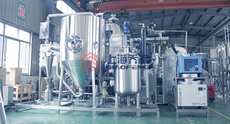 首先,液態(tài)物質被送入噴霧器中,在高速噴嘴的作用下,噴出微小的顆粒狀物料形成霧滴,然后這些霧滴在干燥室中與高溫高壓的熱風相互作用。在瞬間高溫高壓作用下,霧滴逐漸失去水分,由此升高了氣體的濕度,并在空氣的擾動和攪拌下,將干燥室內(nèi)氣體的溫度和濕度保持在一定的范圍內(nèi)。